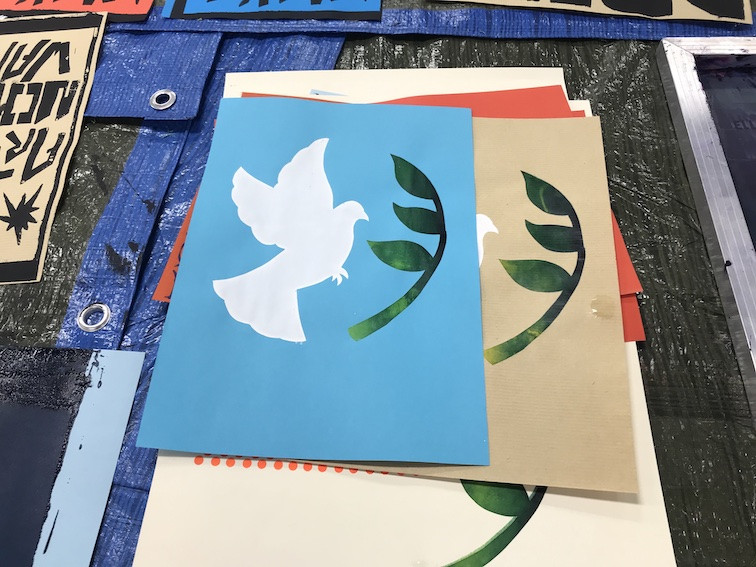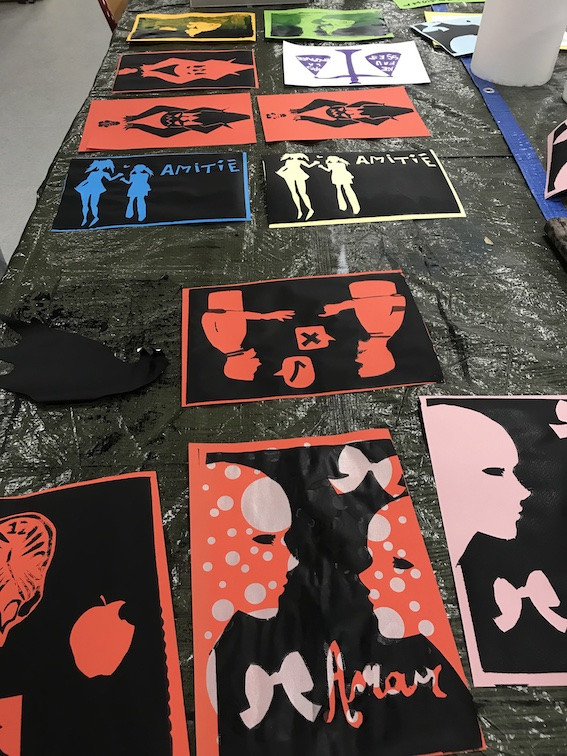 Pour accompagner la présentation, dans le LAC du lycée, des affiches de la commande nationale MESSAGES/IMAGES, graphisme d’intérêt général, 3 ateliers de sérigraphie ont été animés par plus vite.