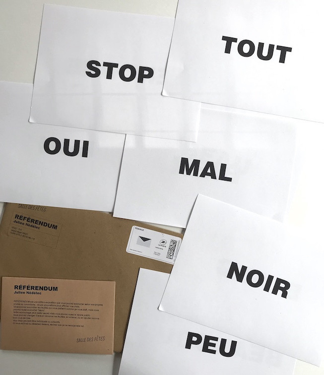 RÉFÉRENDUM est une édition-exposition que vous pouvez accrocher selon vos propres envies ou convictions : douze propositions pour affirmer vos choix. Vous pouvez accrocher les feuilles qui vous plaisent comme ça vous plaît, mais vous pouvez aussi accrocher “blanc”. Votre accrochage peut rester secret mais vous pouvez aussi le rendre public. Vous pouvez changer d’avis et retourner les feuilles, en enlever, ou en ajouter comme bon vous semble. Vos choix peuvent être individuels ou collectifs. Si vous écrivez ou dessinez dessus, sachez que ça ne sera jamais nul. - Éditeur·ice